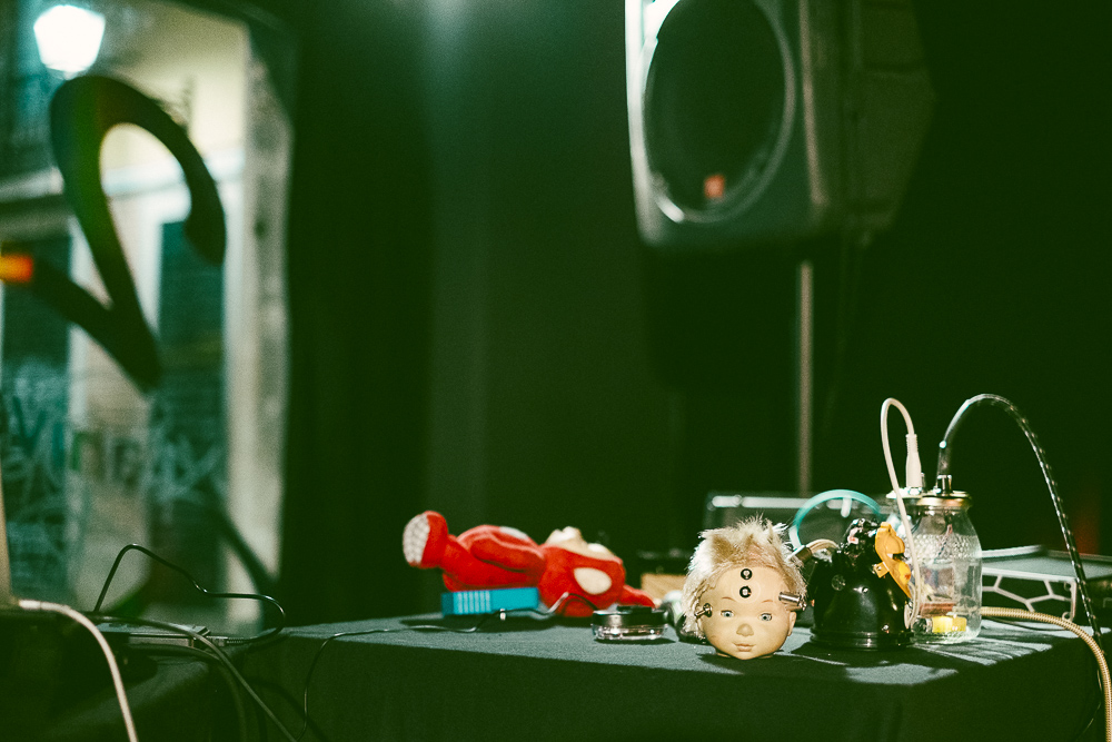 Handmade electronic and percussion instruments linked with a psychedelic visual installation